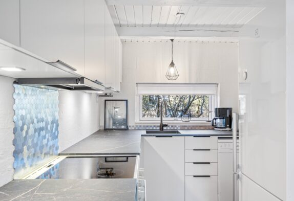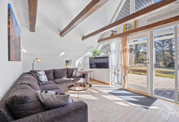 In diesem gemütlichen Ferienhaus könnt ihr eine schöne Zeit mit eurer Familie oder Freunden verbringen. Die hellen Farbtöne und hohen Decken des großzügigen Wohnraumes sorgen für eine wohlige Atmosphäre, in der man gerne Zeit verbringt. Durch die Fensterfront kommt viel Licht herein und ihr könnt gleichzeitig den Blick ins Freie genießen.