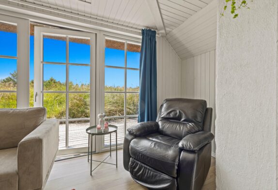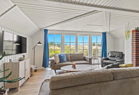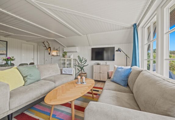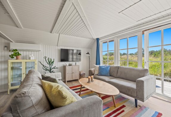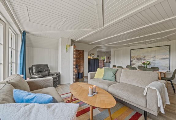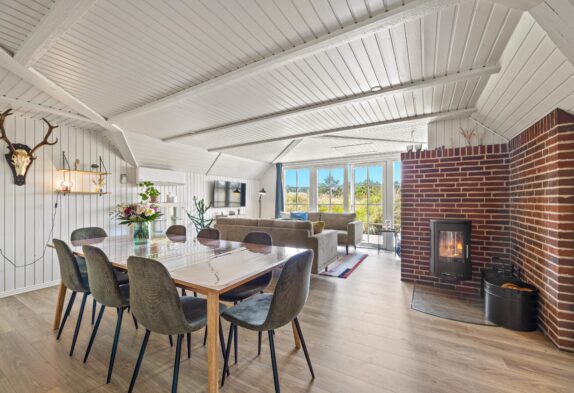Das Herz des Hauses ist der gemütliche, verwinkelte Wohnbereich, mit den bodentiefen Fenstern, die nicht nur viel Licht rein lassen, sondern auch einen schönen Ausblick in die Natur gewähren. Hier wurde kein Platz verschenkt, denn es gibt verschiedene „Hyggeplätzchen“ im Wohnbereich, wo man die Füße hochlegen und abschalten kann. Dazu gehört im Dänemark Urlaub natürlich noch ein knisterndes Feuer im Kaminofen. Die Küche hat eine moderne Ausstattung und ist durch einen Tresen, der aus alten Klinkern gemauert ist, vom Wohnbereich getrennt.