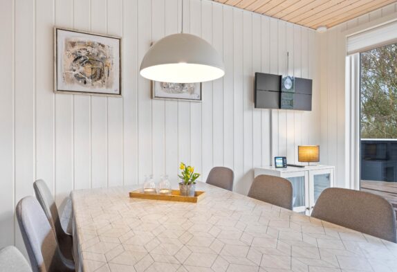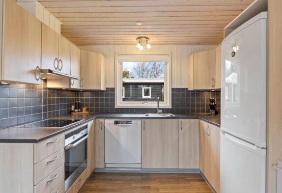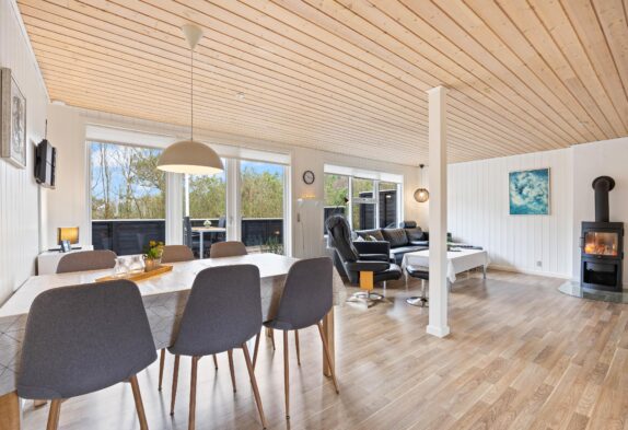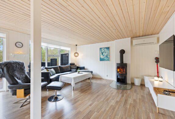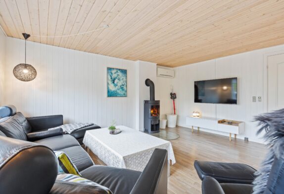 Das Ferienhaus im Fyrrekrat 3 ist hell und gemütlich eingerichtet. Der Wohn-/ Essbereich mit Küche ist offen gestaltet, sodass hier keiner allein in der Küche stehen muss. Ihr könnt viel gemeinsame Zeit miteinander verbringen, da die Spülmaschine nach dem Essen den lästigen Abwasch übernimmt. Die Sitzecke mit Sofa, Sessel und Holzofen sorgt für Gemütlichkeit. Die Leselampen sorgen für genügend Licht, damit ihr ein Buch lesen oder mit euren Handarbeiten sitzen könnt. Am Esstisch könnt ihr euch treffen um Pläne für die nächsten Tage zu machen. Es wurde eine energiesparende Luft-zu-Luft Wärmepumpe installiert, damit ihr im Wohnbereich ein angenehmes und konstantes Raumklima habt.
