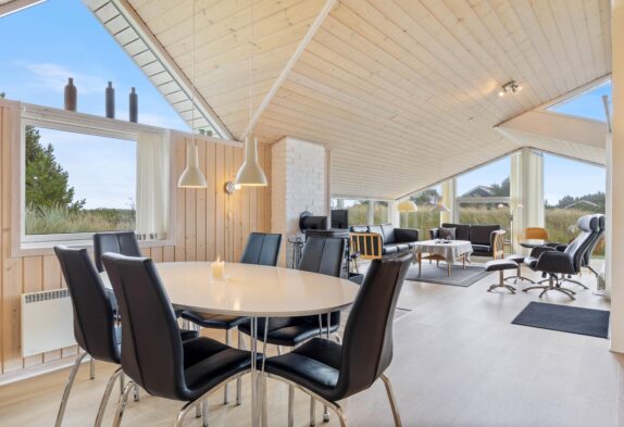 Dieses Haus empfängt euch mit einer fantastischen Wohnatmosphäre. Hohe Decken und viele Fenster lassen dieses Ferienhaus freundlich und einladend wirken. Macht es euch vor dem Kamin gemütlich, entspannt euch im Whirlpool oder trefft euch zum gemeinsamen Filmabend im Wohnzimmer auch mit deutschen Programmen, all dies ist möglich. In der gut ausgestatteten offenen Küche bringt das Kochen richtig Spaß und am Esstisch kann dann nach dem Abendessen der Spieleabend eingeläutet werden.