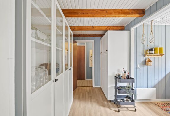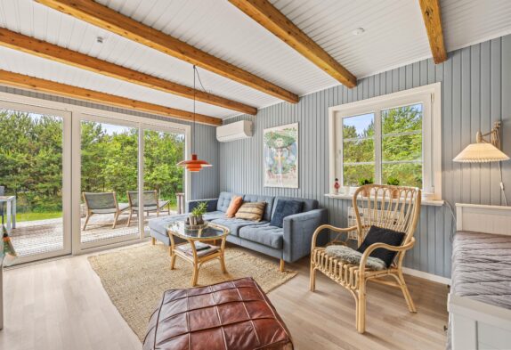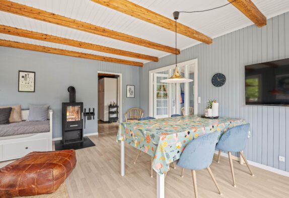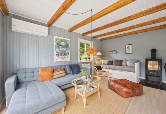 Mit sanftem Licht und warmen Holztönen empfängt ihr dieses schöne Sommerhaus in Henne Strand in einer einladenden Atmosphäre. Der geräumige Wohnbereich ist mit einem charmanten Kaminofen ausgestattet, der an kühlen Abenden für wohlige Wärme sorgt. Die installierte Wärmepumpe sorgt auch an kalten Tagen für eine angenehme Raumtemperatur.