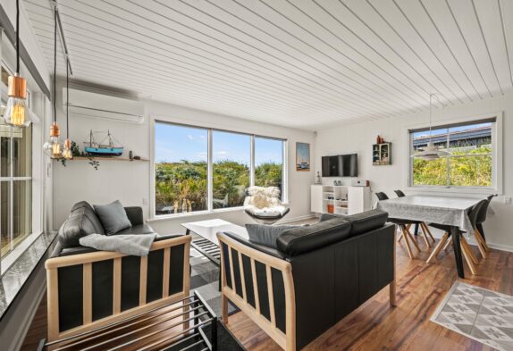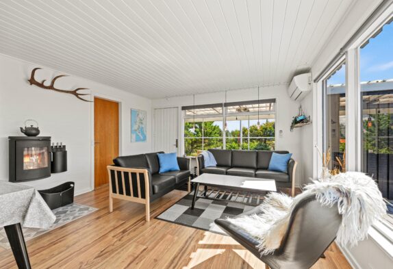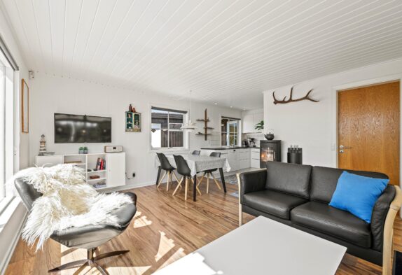 Direkt beim Betreten des gepflegten Ferienhauses fällt einem der helle, freundliche Wohnbereich auf, welcher einen wundervollen Blick auf das umgebende Naturgrundstück bietet. Hier erlebt ihr den typisch skandinavischen Einrichtungsstil, der Funktionalität und Gemütlichkeit harmonisch vereint.