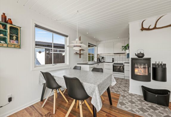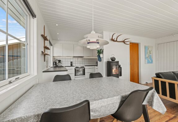 Ein Fernseher und eine Bluetooth-Lautsprecheranlage sorgen für Unterhaltung, während der Kaminofen und die energiesparende Wärmepumpe das Ferienhaus angenehm warm halten. Hier könnt ihr auf dem Sofa die Seele baumeln lassen oder am Esstisch leckere Gerichte genießen.