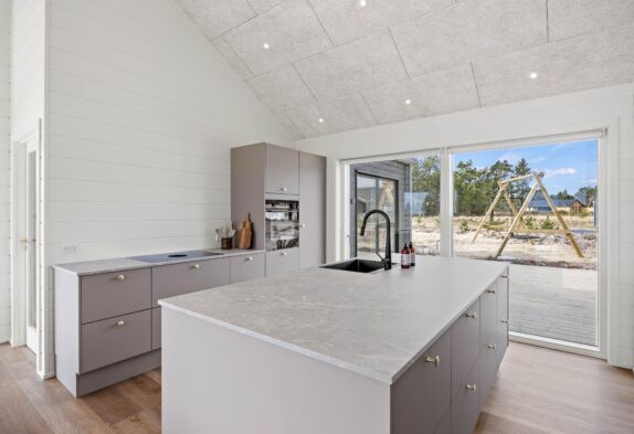 Eine moderne Küche mit Spülmaschine und einem separaten 80-Liter-Gefrierschrank erleichtert das Zubereiten gemeinsamer Mahlzeiten. Das Ferienhaus ist zudem praktisch mit einer Waschmaschine und einem Trockner ausgestattet.