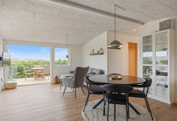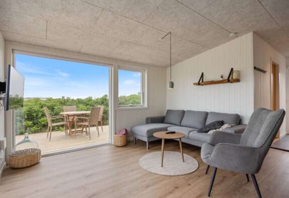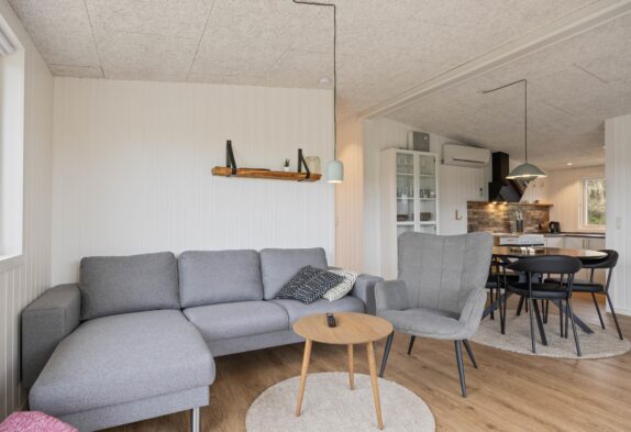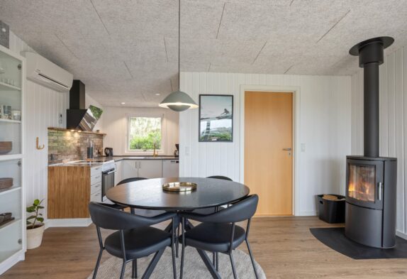 Im liebevoll eingerichteten Wohnbereich, der das Zentrum des Ferienhauses bildet, findet ihr alles, was ihr für einen erholsamen Aufenthalt benötigt. Ein Fernseher und ein Bluetooth-Lautsprecher sorgen für beste Unterhaltung, während der Kaminofen und die energiesparende Wärmepumpe zu einem behaglichen Ambiente beitragen. Genießt die Aussicht durch die großen, teils bodentiefen Fenster, die zeitgleich viel natürliches Licht hereinlassen.