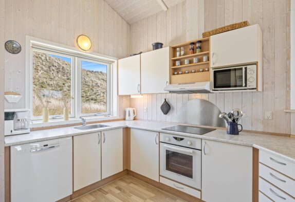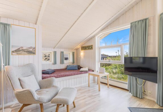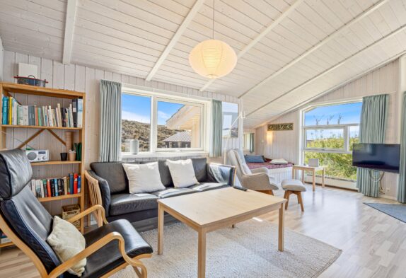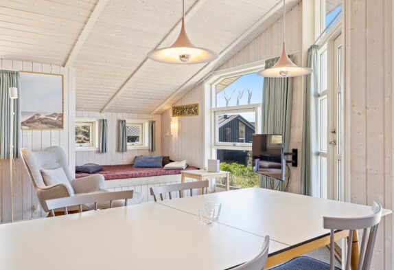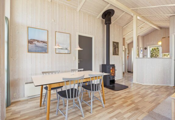 Betrete ein klassisches dänisches Ferienhaus, das sowohl Gemütlichkeit als auch Funktionalität bietet. Im offenen Wohnbereich erwartet dich ein Fernseher neben dem einladenden Kaminofen, der Wärme und Atmosphäre spendet. Mach es dir mit deinem Lieblingsbuch auf dem Sofa bequem und entspanne dich, während das Kaminholz im Hintergrund knistert.