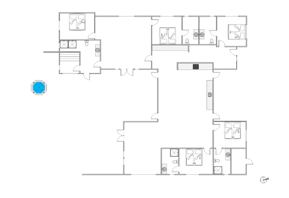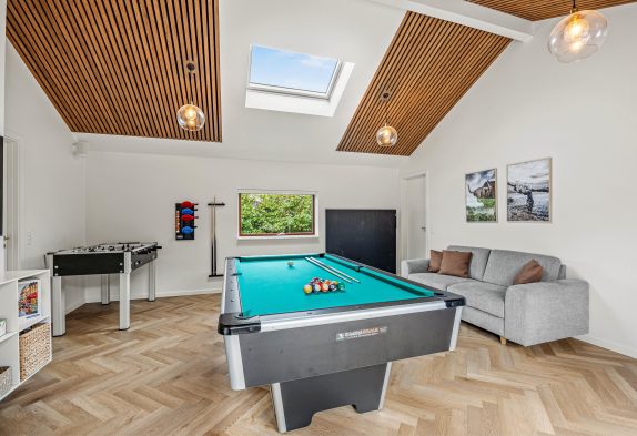 Das Ferienhaus ist mit einem Gespür für Ästhetik und Funktionalität eingerichtet. Die 5 hellen und geräumigen Schlafzimmer bieten Platz für 10 Personen, und dank der 5 Badezimmer gibt es morgens keine Warteschlangen. Der große Wohnbereich kombiniert Küche mit Geschirrspüler, Essbereich und Wohnzimmer in einem – ideal für gemeinsame Aktivitäten. Während einer das Abendessen zubereitet, können andere am Esstisch Spiele spielen oder sich mit einem guten Buch auf das Sofa kuscheln. Die großen Fenster im Wohnzimmer laden die Natur ein, sodass man auch an einem regnerischen Tag die Umgebung genießen kann.