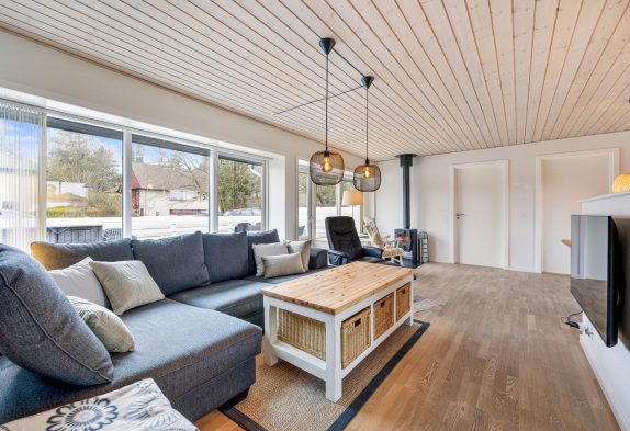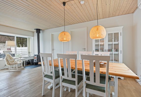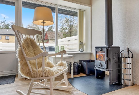 Im Inneren überzeugt das Ferienhaus durch seine durchdachte Raumaufteilung und die Ausstattung. Das Wohnzimmer lädt mit seinem Kaminofen zu gemütlichen Stunden ein – besonders an kühleren Tagen sorgt das flackernde Feuer für eine wohlige Wärme. Eine energiesparende Wärmepumpe und Fußbodenheizung ergänzen den Komfort. Die offene Küche ist mit allem ausgestattet, was du für die Zubereitung eurer Lieblingsgerichte brauchst, einschließlich einer Spülmaschine, Waschmaschine und Trockner.