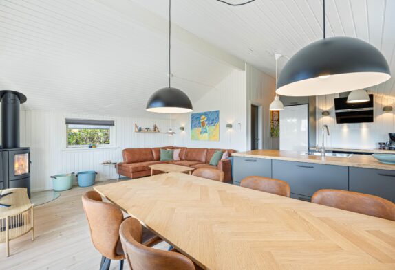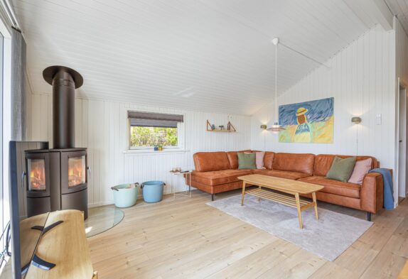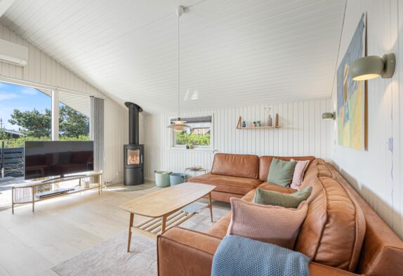 Vom Wohnzimmer mit dem wärmenden Kaminofen habt ihr einen fantastischen Blick auf die schöne Natur in Bjerregård. Für eine angenehme Raumtemperatur sorgt eine energiesparende Wärmepumpe, die im Sommer auch als Klimaanlage genutzt werden kann. Im Wohnzimmer könnt ihr euch gemeinsam vor dem Fernseher entspannen.