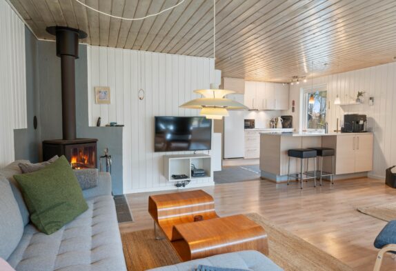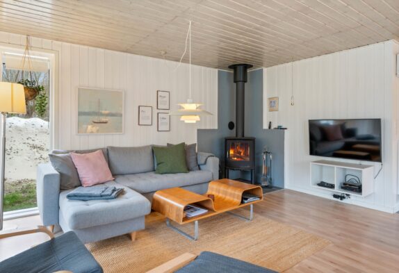 Das Wohnzimmer ist mit komfortablen Möbeln, Flachbildfernseher und Kaminofen gemütlich und einladend eingerichtet. Hier könnt ihr es euch mit einer frischgebrühten Tasse Kaffee am wärmenden Feuer des Kamins bequem machen, nachdem ihr von eurem ausgiebigen Strandspaziergang heimgekehrt seid.