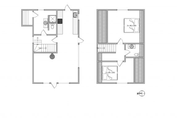 Im Obergeschoss gibt es zwei Schlafzimmer – beide mit elektrischen Boxspringbetten und Schiebetürschränken. Dazu hast auch ein WC und eine gemütliche Leseecke.