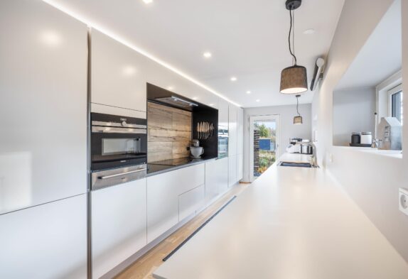 Die Küche ist gut ausgestattet, und hier hast du schön Platz für gemeinsames Kochen und sogar auch einen Tellerwärmer und eine Nespresso Kaffeemaschine.