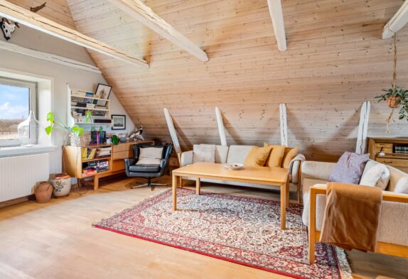 Im ersten Stock befindet sich eine große, schöne Dachstube, in der man die Seele baumeln lassen kann. Eine Leiter führt zum Dachboden, wo eure Kinder spielen können, während ihr es euch auf dem Sofa bequem machen könnt.