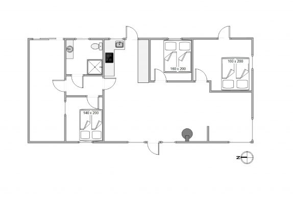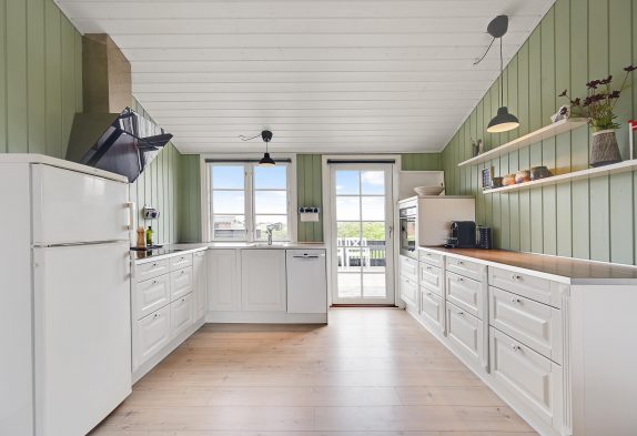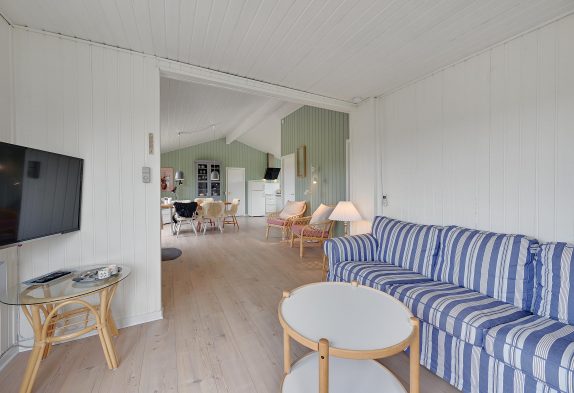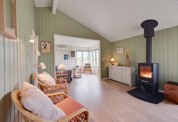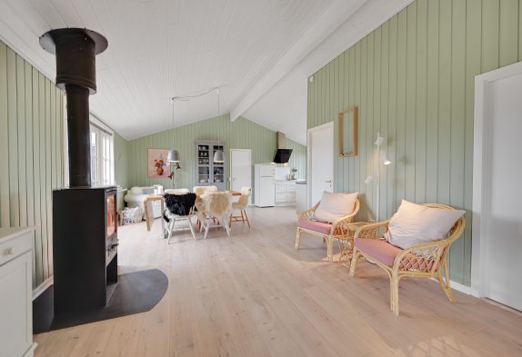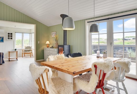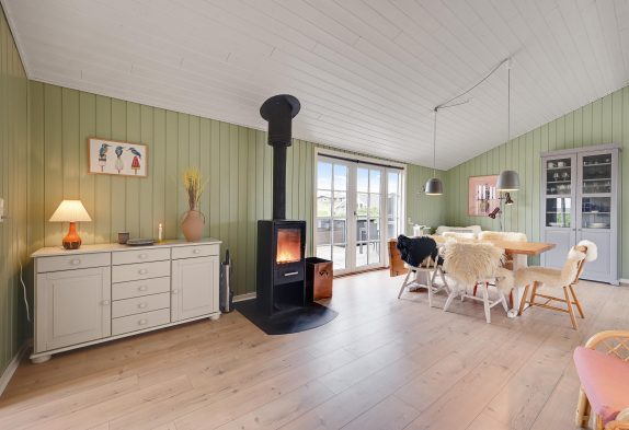 Mit einer Fläche von 83 qm² in einem offenen Wohnkonzept bietet das Ferienhaus genügend Platz für bis zu sechs Personen. Die voll ausgestattete Küche lädt zu gemeinsamen Kochevents ein und die Spülmaschine erledigt danach den lästigen Abwasch. Danach könnt ihr euch am Esstisch treffen, um Pläne für die nächsten Tage zu schmieden oder einen lustigen Spieleabend zu veranstalten. Der Holzofen trägt zur Ferienhausatmosphäre bei und die energiesparende Luft – zu-Luft Wärmepumpe sorgt für ein konstantes Raumklima im Wohnbereich.