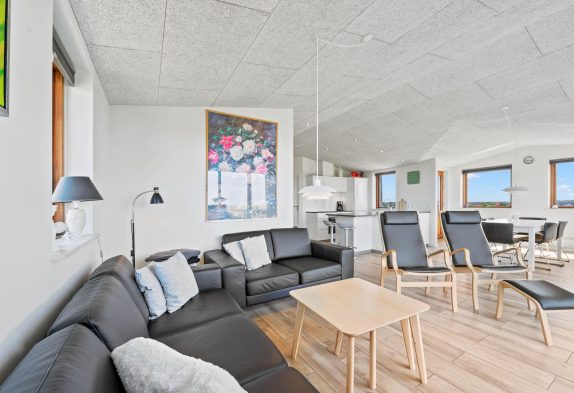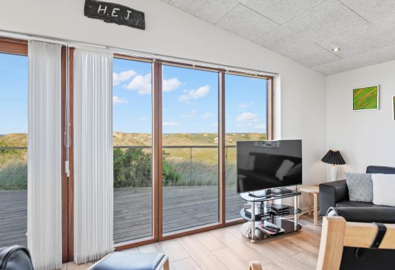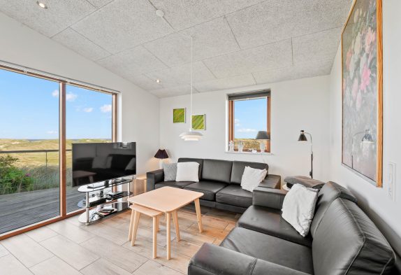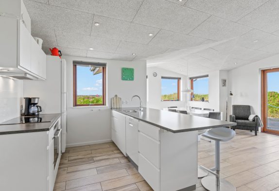 Egal, ob du im Sofa sitzt, in der funktionellen Küche Essen vorbereitest oder das Essen am Esstisch genießt, durch die großen Panoramafenster des Wohnzimmers hast du die ganze Zeit Aussicht zur Nordsee.