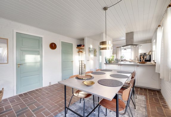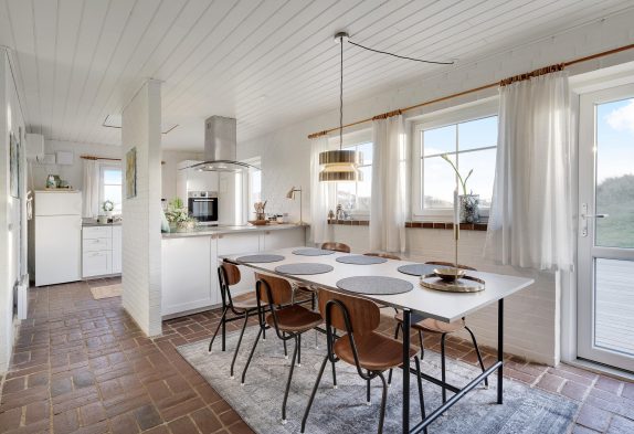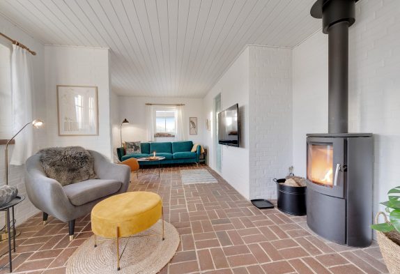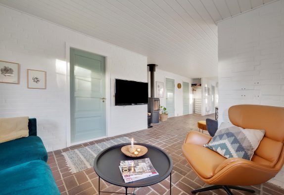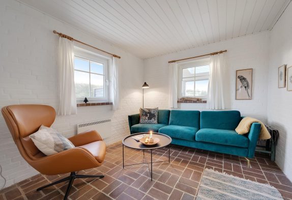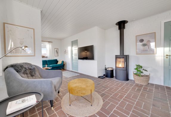 Im Zentrum des Ferienhauses im Auroravej 40 steht der lichtdurchflutete Wohnraum mit Klinkerboden, von dem alle anderen Räume erreichbar sind. Der typisch skandinavische Einrichtungsstil in natürlichen Farbtönen und die liebevoll ausgewählte Einrichtung bilden ein harmonisches Gesamtbild und sorgen für eine gemütliche Atmosphäre.