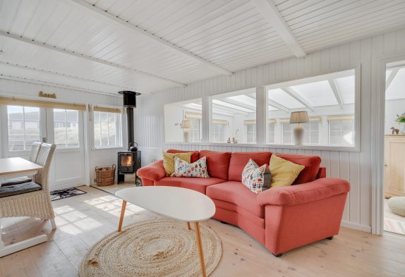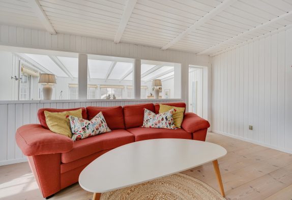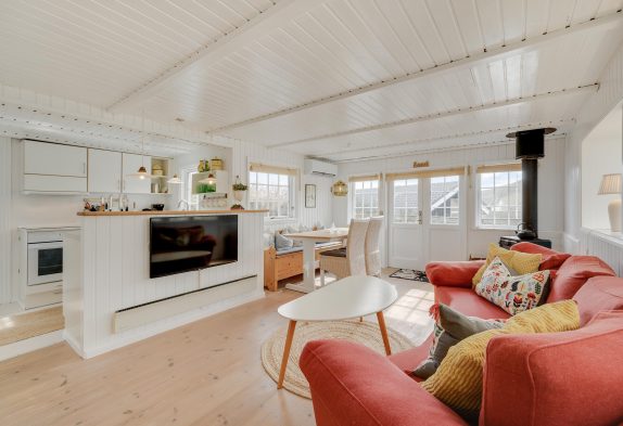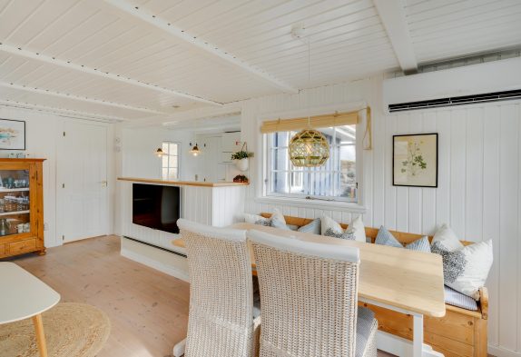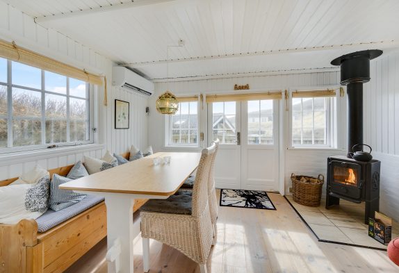 Dieses Ferienhaus strahlt nicht nur dänische Gelassenheit aus, sondern bietet euch auch die Möglichkeit, den Alltag hinter euch zu lassen eine schöne gemeinsame Zeit zu verbringen. Der offen gestaltete Wohnraum ist optimal für gemeinsames Kochen und auch gemeinsames Abwaschen, da es keine Spülmaschine im Ferienhaus gibt. Danach könnt ihr es euch vor dem Holzofen gemütlich machen und dem Knistern des Feuers lauschen oder ihr setzt euch in den Wintergarten, der euch eine schöne Kulisse bietet, um die Natur zu genießen, unabhängig vom Wetter. Eine moderne Wärmepumpe sorgt für ein angenehmes Raumklima zu jeder Jahreszeit.