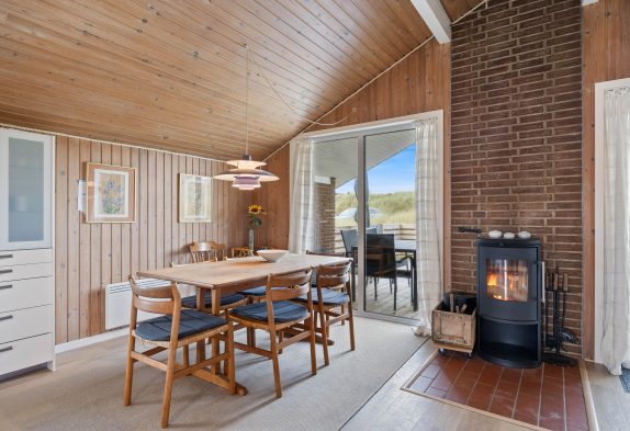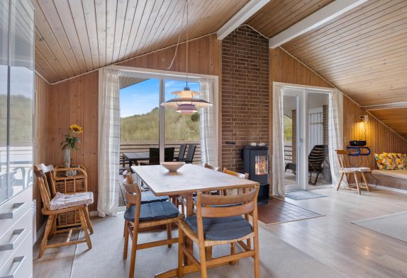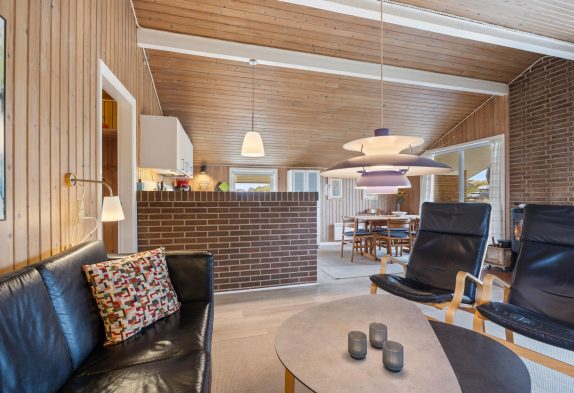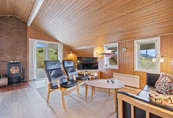 Innen mit Holz verkleidet erwartet euch euer gemütliches Ferienhaus mit einem großen Wohnbereich und firsthoher Decke, das sowohl Küche als auch Essbereich und Wohnzimmer umfasst. Hier ist Platz für eine gemütliche Auszeit vom Alltag.