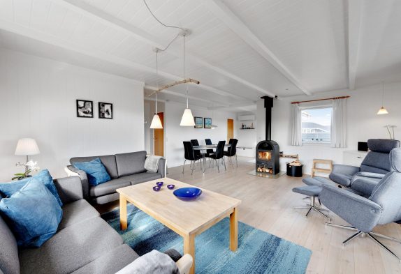 Der offene Wohnraum ist gemütlich eingerichtet. Hier könnt ihr es euch im Sessel bequem machen, während der Kaminofen im Hintergrund knistert. Am Abend könnt ihr einen Film schauen oder euch mit der Playstation 4 gegenseitig herausfordern, vergesst dazu nicht eure eigenen Spiele.