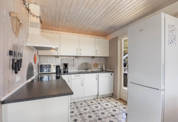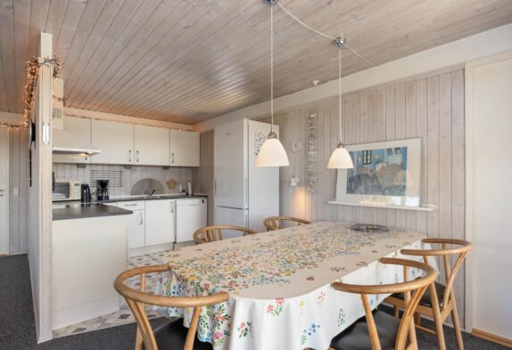 Dieses Ferienhaus strahlt typisch dänische Gemütlichkeit aus. Im großzügigen, lichtdurchfluteten Wohnraum könnt ihr euch für einen geselligen DVD-Abend auf das Sofa kuscheln. Die offen gestaltete Küche befindet sich direkt daneben. Hier findet ihr eine vollständige und gepflegte Ausstattung,zu der natürlich auch ein Geschirrspüler zählt.