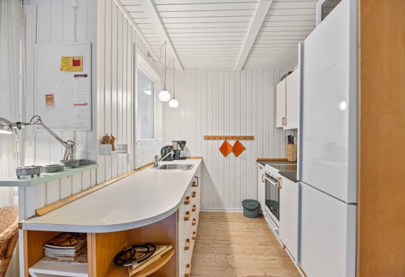 Ein besonders gepflegtes Ferienhaus mit kleiner, gut ausgestatteter Küche. Diese liegt in offener Verbindung mit dem großen Wohnraum, welcher sowohl den Ess- als auch den gemütlichen Wohnbereich mit Kamin, TV mit Parabolempfang, DVD und CD-Radio beinhaltet.
