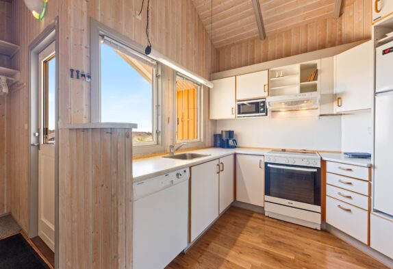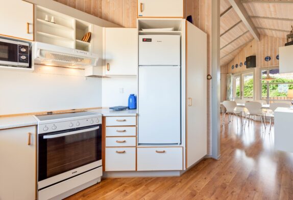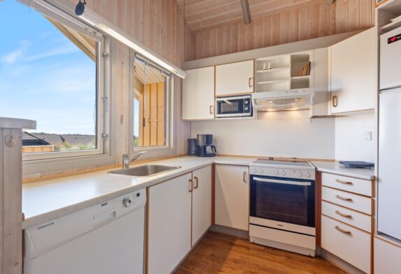 In der hellen und funktionellen Küche sind Kühlgefrierschrank (40L), Mikrowelle und Spülmaschine vorhanden – hier könnt ihr eure Lieblingsspeisen zubereiten. Das Ferienhaus wird von einer Wärmepumpe geheizt, welche eine energiesparende Heizmethode ist und die Stromkosten gering hält.