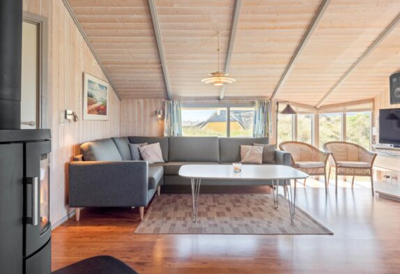 Dieses Ferienhaus für 8 Personen hat ein Wohnzimmer mit hoher Decke, gemütlichem Essbereich und räumigem Ecksofa, wo der Kaminofen an kalten Tagen für Wärme sorgt. Und hier könnt ihr euch beim Fernsehen mit DVD-Spieler, Stereoanlage und freien drahtlosen Internet entspannen.