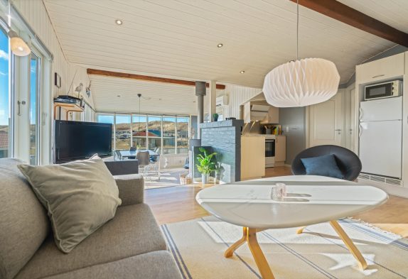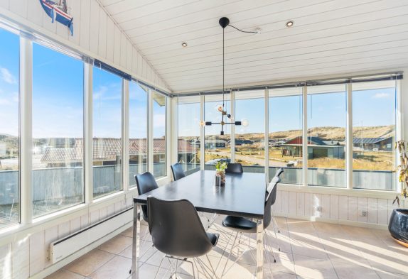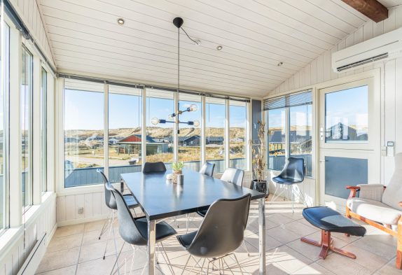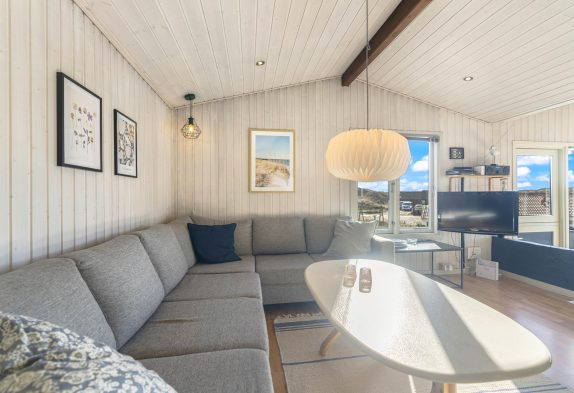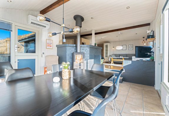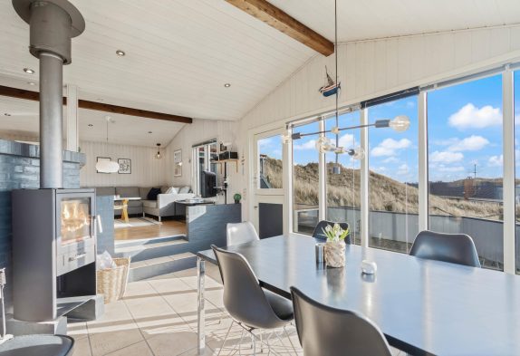 Im Wohnbereich erwartet euch eine schlichte Einrichtung mit hellen Farben und großen Fenstern, die für viel Licht sorgen und einen schönen Panoramablick ermöglichen. Am Esstisch könnt ihr den Blick über die Dünen schweifen lassen, während ihr eure Mahlzeiten aus der offenen Küche genießt oder gemeinsam spielt.