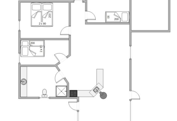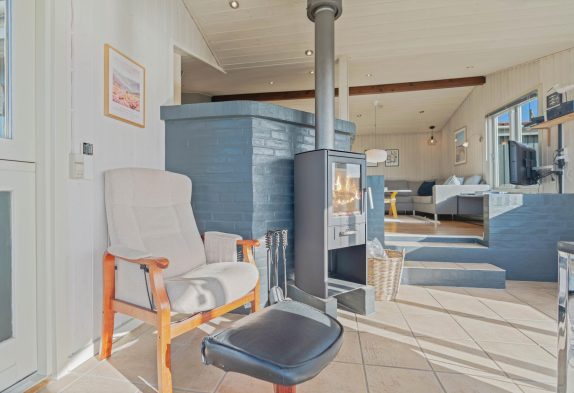 Wenn ihr den Kamin anzündet, begleitet euch das Knistern des Holzes. Alternativ steht euch die Wärmepumpe als praktische Heizquelle zur Verfügung. Das Badezimmer ist einfach gestaltet und bietet eine Dusche sowie Fußbodenheizung. Für die Nachtruhe gibt es drei Schlafzimmer: eines mit Doppelbett, eines mit zwei Einzelbetten und eines mit Hochbett.