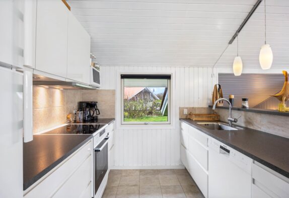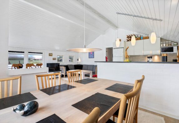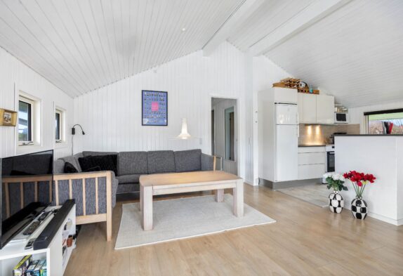 Dieses schöne Ferienhaus ist hell und einladend gestaltet, mit hohen Decken in Wohnzimmer und Küche, sowie zahlreichen Fenstern, die für natürliches Licht sorgen. Die offene Küche ist modern und gut ausgestattet, u. a. mit Geschirrspüler, Mikrowelle und Gefrierschrank (50 l).