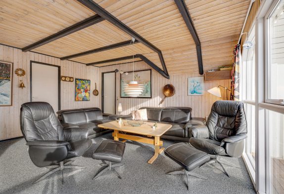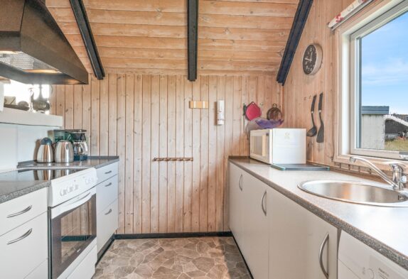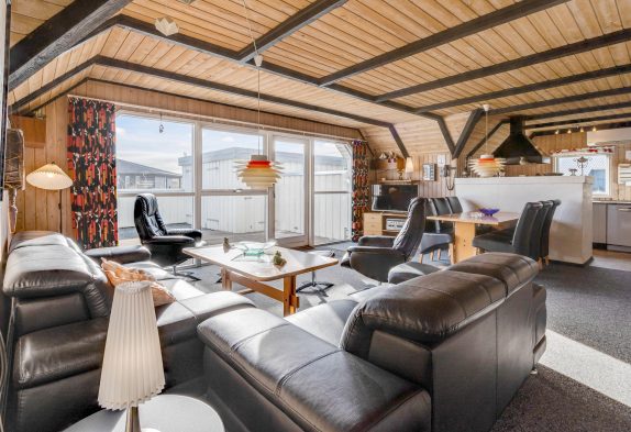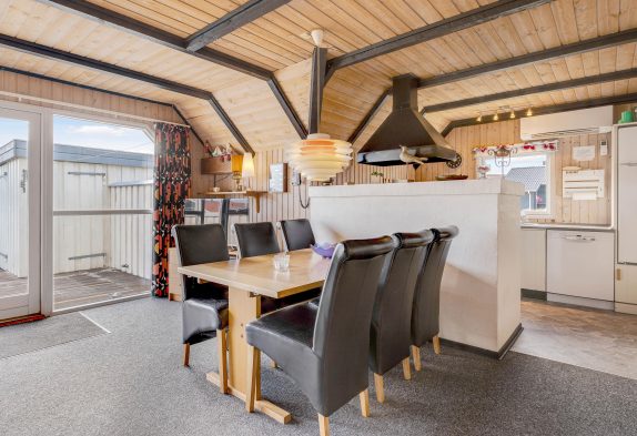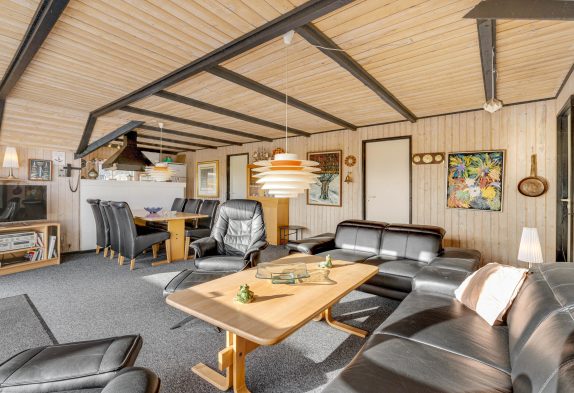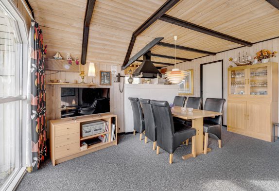 Das gemütliche und geräumige Wohnzimmer bildet das Zentrum des Ferienhauses und ist mit Teppichboden und einer hohen Decke mit sichtbaren Balken ausgestattet, welche für eine angenehmes Atmosphäre sorgen. Hier könnt ihr euch aufs Sofa kuscheln und gemeinsam DVDs schauen oder euer Lieblingsbuch lesen. Dank der energiesparenden Wärmepumpe könnt ihr das Ferienhaus schnell auf eure Wohlfühltemperaturen bringen. Die Küche ist offen mit dem Wohnzimmer verbunden und u.a. mit Spülmaschine, Mikrowelle und Gefrierschrank ausgestattet.