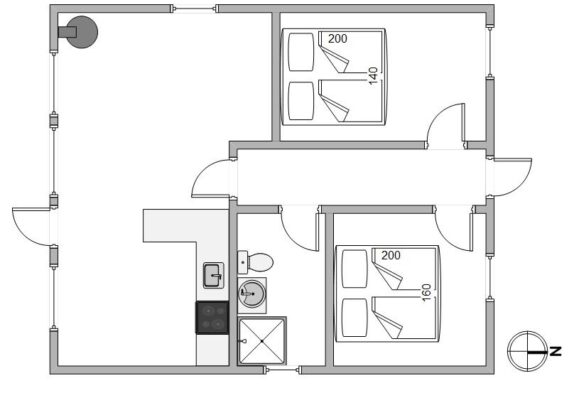 Ihr betretet dieses schöne Ferienhaus durch den praktischen Flur, von dem alle Räume abgehen. Auf beiden Seiten befindet sich je ein gemütliches Schlafzimmer mit Doppelbett, in denen ihr eure Batterien wieder aufladen könnt. Zur Linken wurde das gepflegte Badezimmer mit Dusche platziert. Folgt ihr dem Flur geradeaus, gelangt ihr in den geräumigen Wohnbereich mit offener Küche und Essplatz.