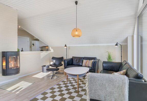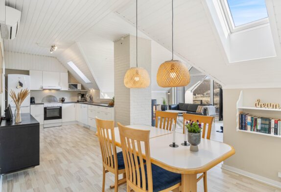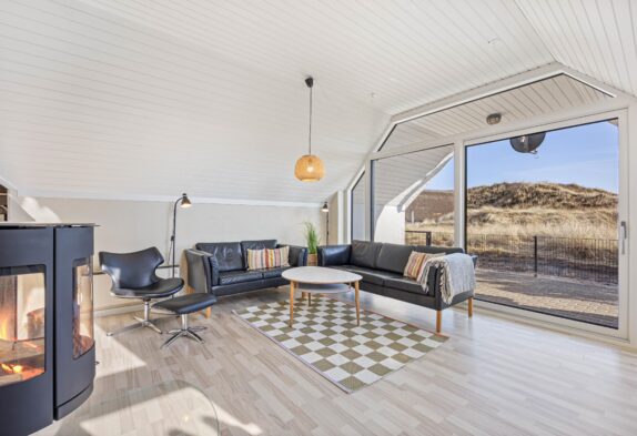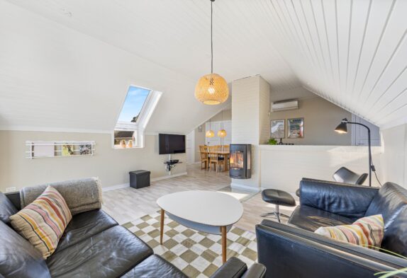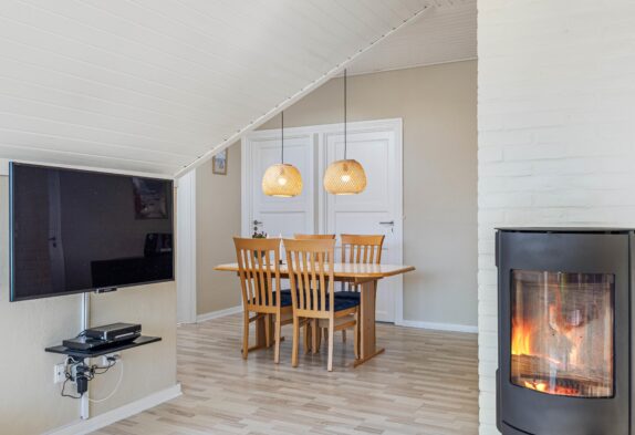 In der großen Küche sind Kühl- und Gefrierschrank, Spülmaschine sowie Mikrowelle vorhanden. Die Küche ist offen mit dem Essbereich und dem Wohnzimmer verbunden. Das Wohnzimmer ist mit guten Möbeln, Holzofen und Holzfußboden schön eingerichtet. Es gibt eine hohe Decke bis unter das Dach und einen wunderbaren Lichteinfall durch die großen Südfenster. Ferner bietet das Haus einen Gratiszugang ins Internet per WLAN und eine Luft-zu-Luft-Wärmepumpe für energiesparende Wärme im Winter und schöne Kühlung im Sommer.