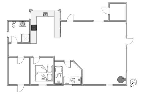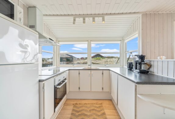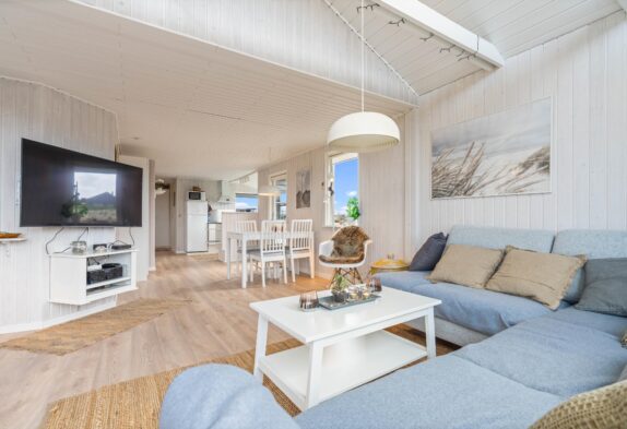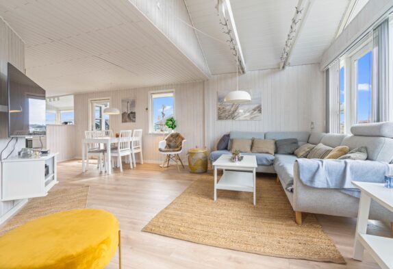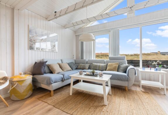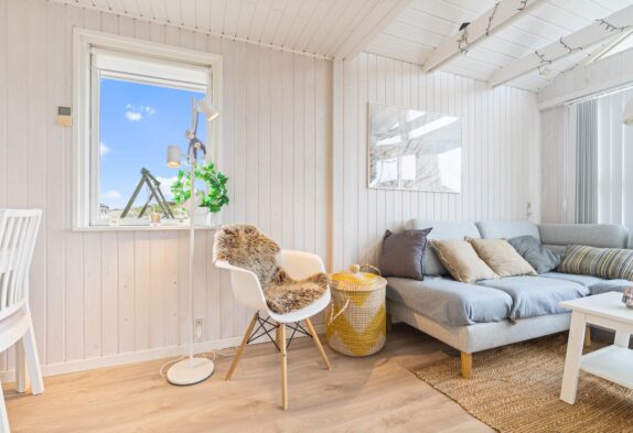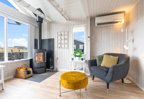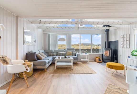 Die Räume in eurem gemütlichen Ferienhaus sind hell gestaltet, sowohl die Holzwände als auch die Holzdecken sind hell gestrichen. Die Einrichtung ist durch den Teppichboden, der im Wohnraum und in den Schlafzimmern verlegt ist, sehr gemütlich und die Knistern im Kamin verbreitet eine kuschelige Wärme und lädt zum Entspannen ein, während ihr den Ausblick auf die schöne Natur Westjütlands genießt.