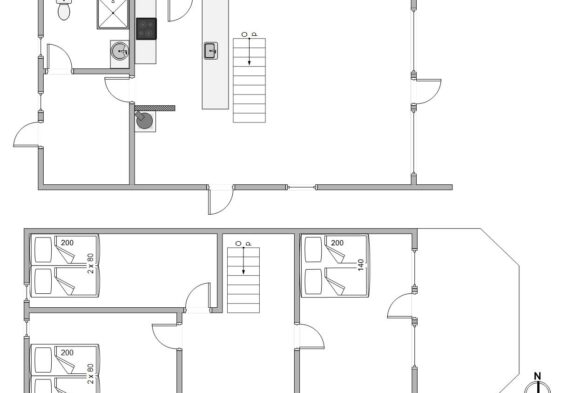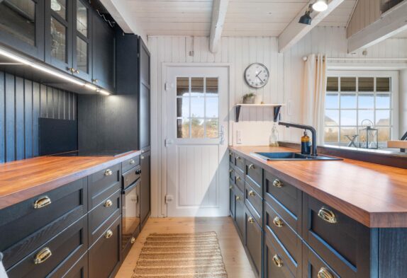Im Erdgeschoss liegt der schöne Wohnbereich mit offener Küche und Essplatz. Auf dem bequemen Sofa könnt ihr es euch gemütlich machen und Fernsehen oder bei knisterndem Kaminfeuer euer Lieblingsbuch lesen. Ergänzend zum Kamin, könnt ihr auch mit der energiesparenden Wärmepumpe heizen. Die moderne, offenen Küche bietet eine vollständige Ausstattung, zu der auch eine 90 l Gefriermöglichkeit gehört. Hier könnt ihr den einen oder anderen frisch gefangenen Fisch unterbringen.
