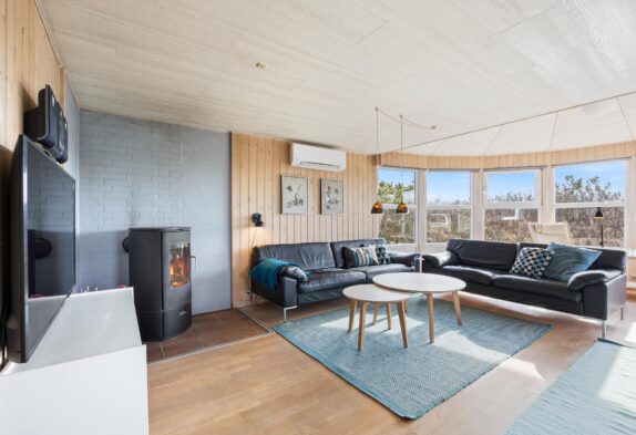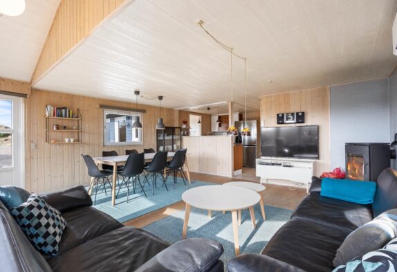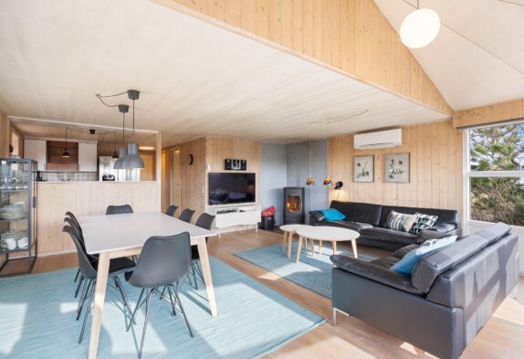 Ein schick eingerichtetes Qualitätshaus mit fantastischem Lichteinfall im großen Wohnzimmer mit Ess- und Aufenthaltsbereich, wo die gedigene Möblierung und der gemütliche Kamin zu vielen entspannten Stunden während der Ferien einlädt.