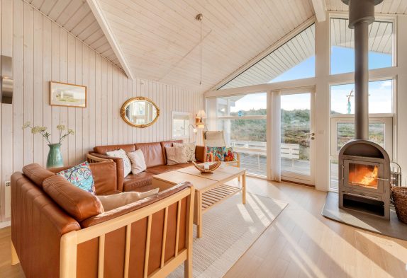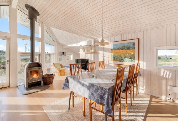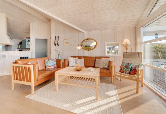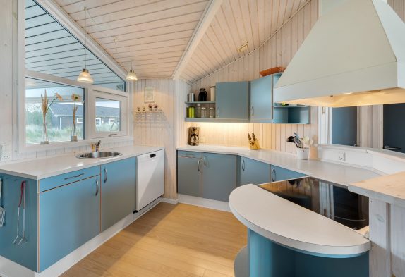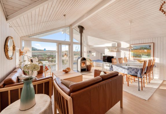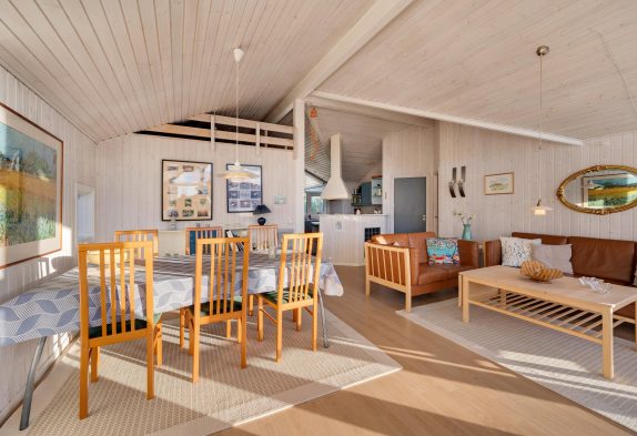 Die Küche und der Wohnbereich hat hohe Decken, die Küche ist mit Geschirrspüler, Mikrowelle und einem 10 Liter Gefrierfach ausgestattet. Das Wohnzimmer wurde gemütlich eingerichtet, verfügt über einen Holzboden und eine schöne Aussicht über die Dünenlandschaft nach Westen.