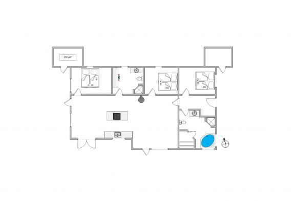 Das Haus hat 2 schöne Badezimmer mit Fußbodenheizung und Duschen. Das große Badezimmer ist mit Whirlpool und Sauna ausgestattet. In dem kleineren Badezimmer stehen Waschmaschine und Trockner zur Verfügung. Die Küche ist mit dem Wohnzimmer verbunden und u.a. mit Spülmaschine, Mikrowelle sowie mit Kühlschrank und großem Gefrierfach ausgestattet.