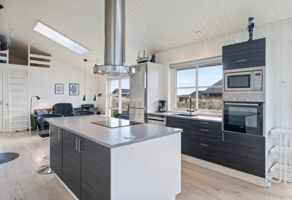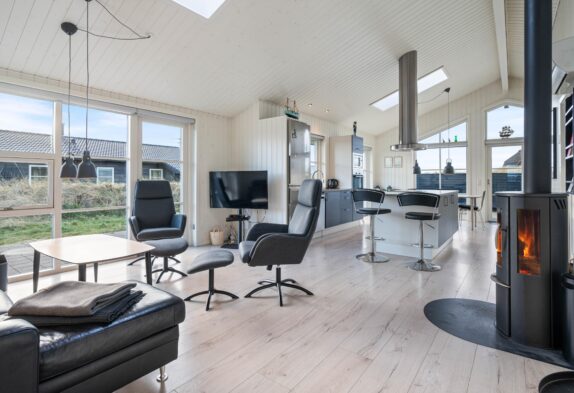 Der schöne Kaminofen steht zwischen der Küche und dem Wohnzimmer, damit er während der Mahlzeiten und in gemütlichen Stunden im Wohnzimmer genossen werden kann. In dem Wohnzimmer, das schön und geschmacksvoll möbliert ist, sind Flachbildschirm, DVD-Player und iPod-Dock vorhanden. Internet mit WLAN-Zugang steht frei zur Verfügung. In dem Ferienhaus gibt es auch einen Zentralstaubsauger und eine energiesparende Wärmepumpe.