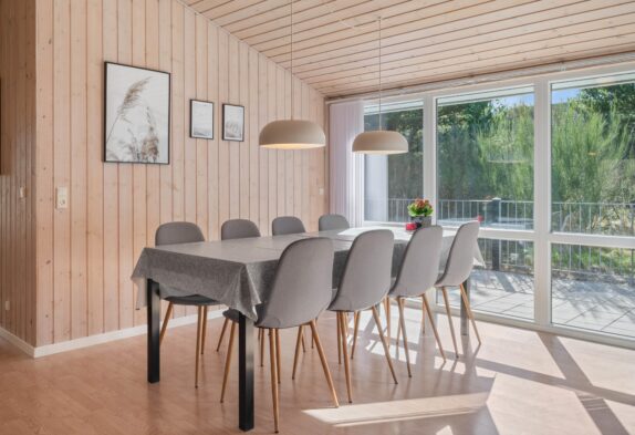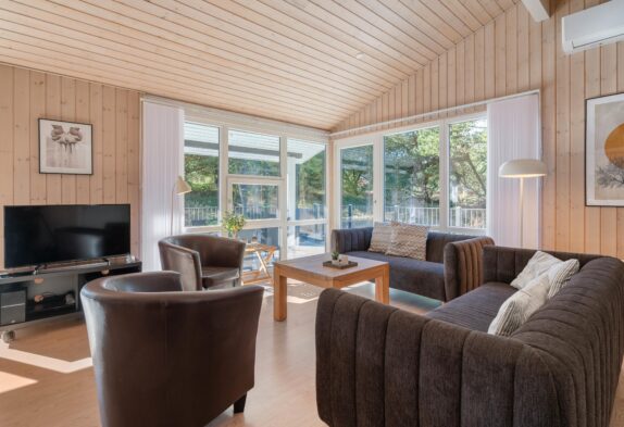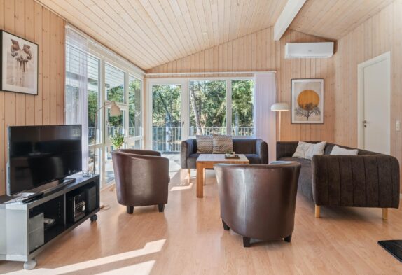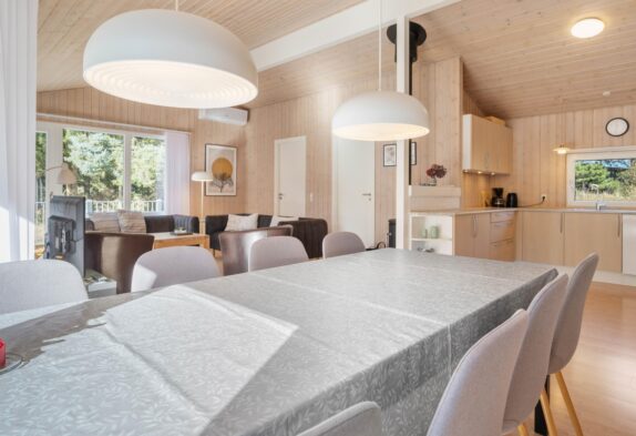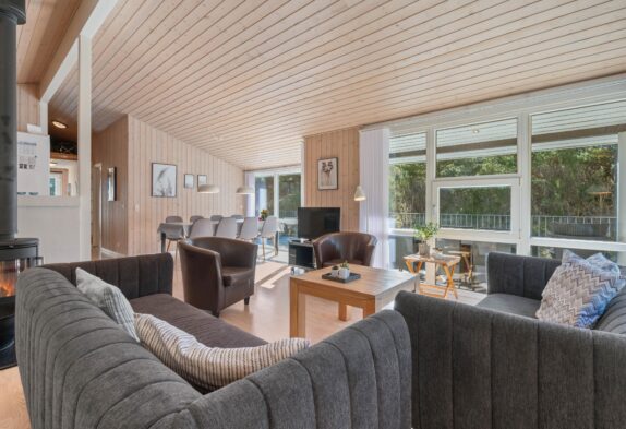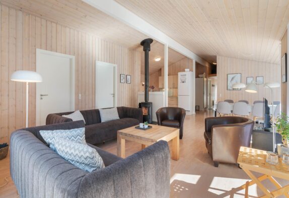 Im Zentrum des Ferienhauses liegt der helle, offene Wohnbereich, der mit bodentiefen Fenstern ausgestattet ist, was für viel natürliches Licht sorgt. Gleichzeitig kannst du den Blick nach Draußen schweifen lassen. Bequeme Sitzmöbel laden zum Verweilen ein, während du bei einem Film den Abend ausklingen lässt. Der prasselnde Kaminofen sorgt für wohlige Wärme, ergänzt durch eine energiesparende Wärmepumpe, die die Temperatur angenehm hält.