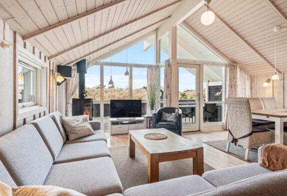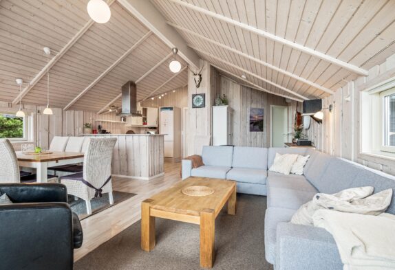 Der große Wohn- und Essbereich mit großen Fenstern nach Westen, schafft zusammen mit dem Holzofen den perfekten Rahmen für gemütliche Stunden im Ferienhaus. Zusätzlich bietet das Haus einen DVD-Spieler, Deutsche TV-Programme, Stereoanlage mit Dab und Bluetooth, und einen gratis WLAN-Anschluss.