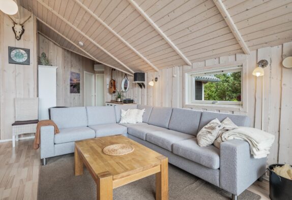 Das Wohnzimmer hat eine firsthohe Holzdecke und der Fußboden mit pflegeleichten Holzlaminat ausgelegt.