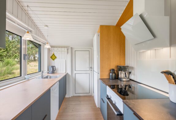 Im Wohnbereich steht ein Kaminofen, der an kalten Tagen nicht nur für Wärme sondern auch für eine gemütliche Stimmung sorgt. Nach einem langen Tag an der frischen Luft am Strand könnt Ihr euch hier ideal entspannen. Das Badezimmer mit Dusche wurde 2013 komplett renoviert. Es ist ein 111 l Gefrierschrank in der Küche vorhanden, sowie Fischreinigungsplatz draussen – ideal für Angler.