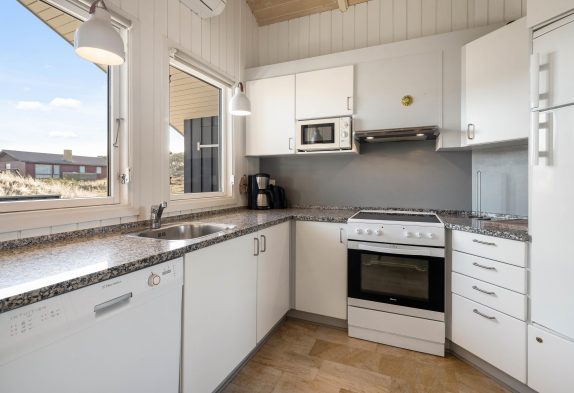 Das Herzstück des Ferienhauses ist der helle und einladende Wohnraum, mit bequemen Möbeln und einem Kaminofen, der euch an kühleren Abenden wohlige Wärme schenkt. Große Fenster sorgen für viel Tageslicht und bieten einen herrlichen Blick in die Dünenlandschaft. Die offene Küche ist vollständig ausgestattet und verfügt über alle modernen Annehmlichkeiten, wie einen Geschirrspüler, einen Herd und eine Mikrowelle. Hier könnt ihr eure Mahlzeiten ganz bequem zubereiten und anschließend gemeinsam am Esstisch genießen.