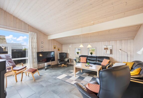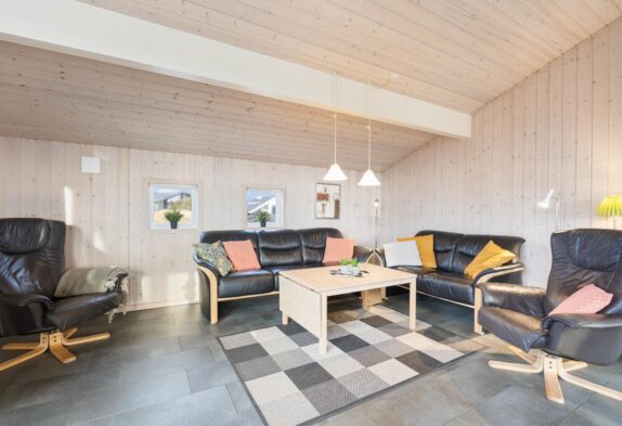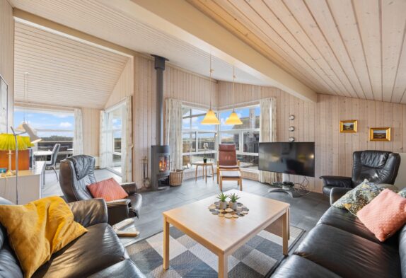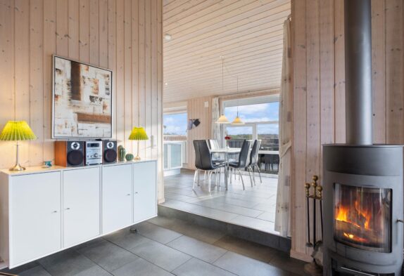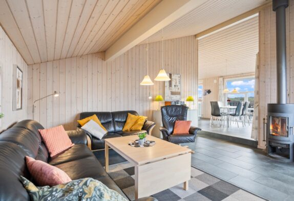 Schon beim Betreten dieses Ferienhauses fühlt man sich direkt wohl. Der großzügige Wohnbereich mit hellen Decken und Fußbodenheizung ist das Herzstück eures Feriendomizils. Hier kann die ganze Familie gesellige Stunden beim Fernsehen, Spieleabend oder gemeinsamen Kochen verbringen. Der Kaminofen trägt zur hyggeligen Atmosphäre bei.