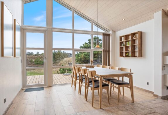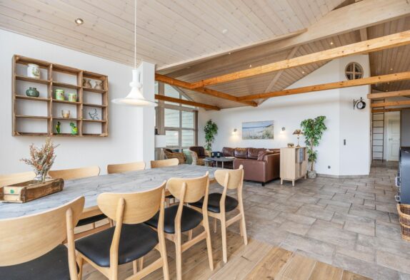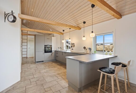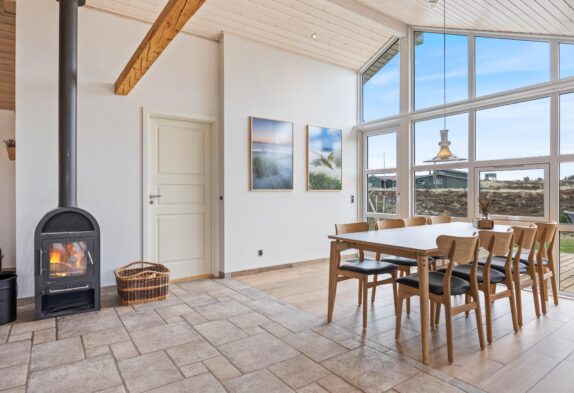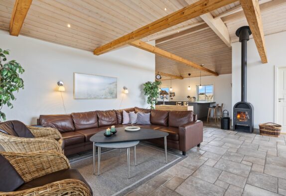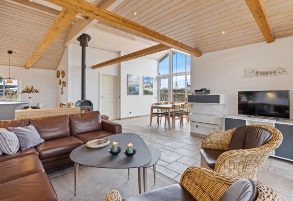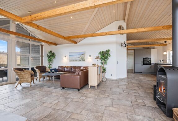 Das Sommerhaus ist geschmackvoll eingerichtet und es wurde an alles gedacht, damit ihr einen wunderbaren und erholsamen Urlaub in einer schönen Umgebung verbringen könnt. Im geräumigen Wohnbereich fällt durch die großen Fenster viel Licht und die offenen Dachbalken verleihen dem Raum eine besonderes gemütliche Atmosphäre. Hier könnt ihr gemeinsam Zeit auf dem Sofa verbringen, Brettspiele spielen und in der gut ausgestatteten Küche kochen, während im Hintergrund der Holzofen knistert.