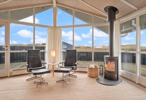 Dieses schöne Ferienhaus verfügt über eine große, geschlossene Terrasse. Genießt den Morgenkaffee und den Blick auf die wunderschöne westjütländische Natur, die direkt angrenzt. Gartenmöbel und Liegestühle laden zu stundenlangem Entspannen auf der Terrasse ein, und der Grill kann angeheizt werden, um das perfekte Abendessen zuzubereiten.