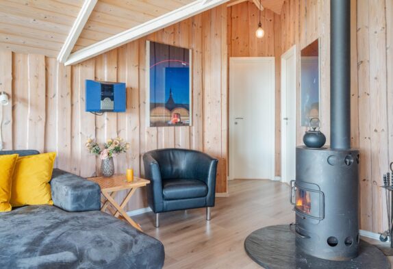 Das Herzstück eures liebevoll eingerichteten Ferienhauses bildet der offen gestaltete Wohnbereich mit der schönen Fensterfront. Hier könnt ihr euch beim Knistern des Kaminfeuers auf das Sofa kuscheln und den Ausblick in die euch umgebende Natur genießen. Für einen geselligen Filmabend steht euch ein DVD-Player am Flachbildfernseher zur Verfügung. Fehlt nur noch das selbstgemachte Popcorn.