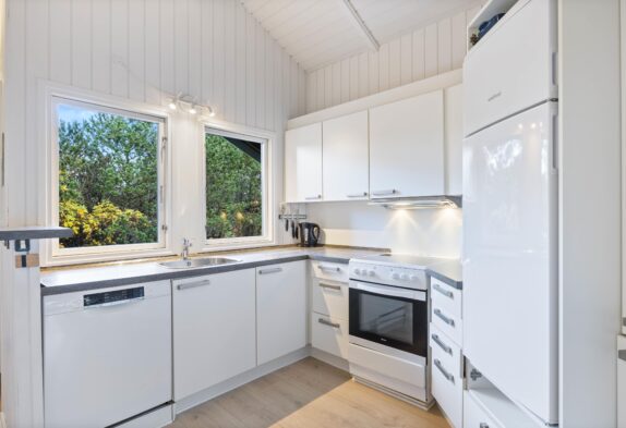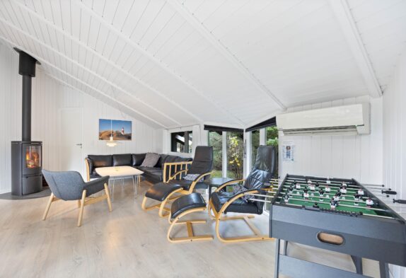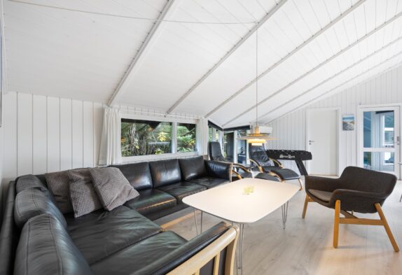 Das Zentrum des Ferienhauses in Bilbergsvej 37 in Bjerregård ist der offene Wohnbereich, in dem es eine Kombination aus Küche, Essbereich und Wohnzimmer gibt. Hier kann die ganze Familie Zeit miteinander verbringen, egal ob die einen kochen und die anderen es sich auf dem Sofa mit einem Film gemütlich machen.