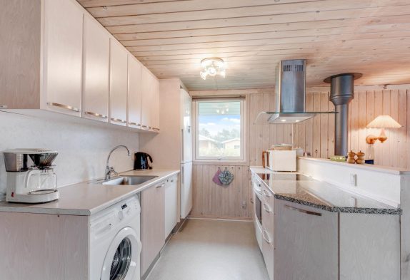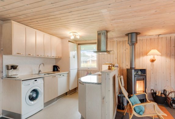 Im Tageslichtbad gibt es eine Duschkabine und Fußbodenheizung, außerdem befindet sich eine Waschmaschine im Ferienhaus, so dass ihr eure Wäsche bei Bedarf auffrischen könnt. In der Küche gibt es u.a. einen Geschirrspüler, einen 90-Liter-Gefriermöglichkeit und eine Mikrowelle. Der Wohnbereich ist richtig gemütlich, und es gibt einen Kaminofen, der sowohl für Gemütlichkeit sorgt als auch eine angenehme Wärme bietet.